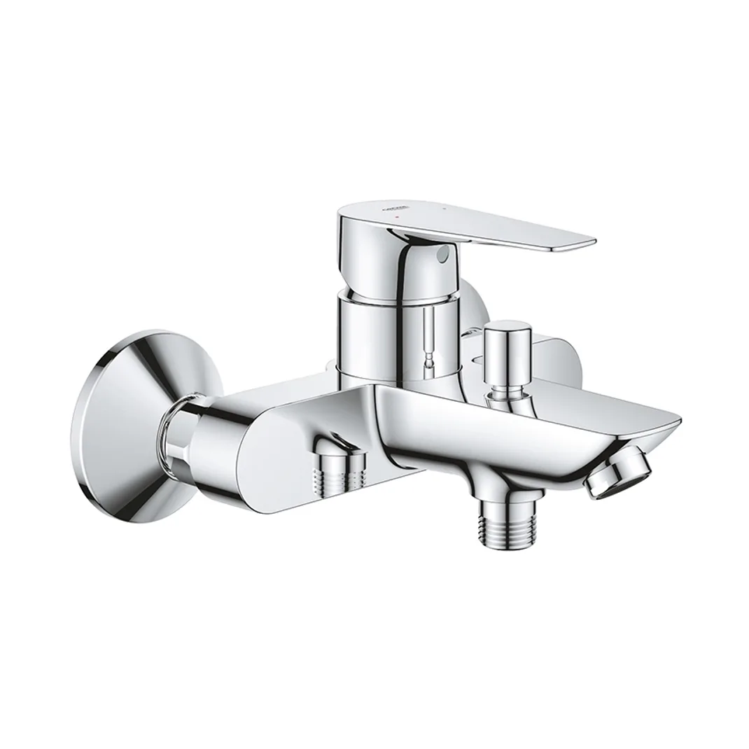Μπαταρία Λουτρού Bauedge αναμεικτική της Grohe για χρήση σε μπανιέρα ή ντουζιέρα, με δύο ροές εξαγωγής του νερού, για σύνδεση με σπιράλ τηλεφώνου ντους ή για ροή από τον κορμό. Το σώμα της μπαταρίας είναι κατασκευασμένο από ορείχαλκο με χρωμέ φινίρισμα και γυαλιστερή επιφάνεια.