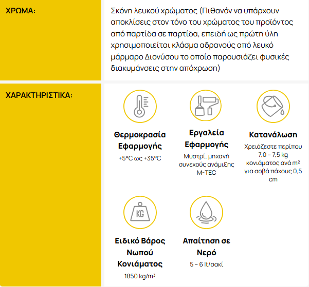 Χρησιμοποιείται κατά την εφαρμογή της τεχνικής των τριών στρώσεων, ως τελική στρώση σοβά (μάρμαρο) σε εξωτερικές επιφάνειες οι οποίες προηγουμένως έχουν επιπεδωθεί με τον σοβά βασικής στρώσης SV 2. Έχει αποδειχθεί ιδανικό ως προστασία απ’ την υγρασία, σε παραθαλάσσιες κατοικίες, νησιά, ορεινές – ημιορεινές περιοχές κ.λ.π. Χάρη στη φύση και τη λεπτή κοκκομετρία του μαρμάρου Διονύσου (< 1,2 mm) που περιέχει, δίνει λευκή και λεία τελική επιφάνεια έτοιμη για τρίψιμο και βαφή. Σε ειδικές περιπτώσεις το προϊόν μπορεί να ενισχυθεί επιπλέον, με την προσθήκη ρητίνης MARMOLINE MP 20.